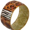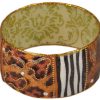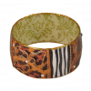 Jump on board the proverbial outback jeep with this safari print cold enamel bangle! Fab for dressing up a little black dress or co-ordinating with other animal print accessories, this bangle showcases zebra, leopard and cheetah designs, adorned with tiny golden beads, diamantes and gold glitter edging. The interior of the bangle is a contrasting cool gold fern pattern.